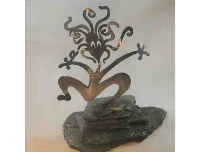 Artist signed whimsical dancing sprite sculpture. It stands about 8 ½” tall and 8” wide.