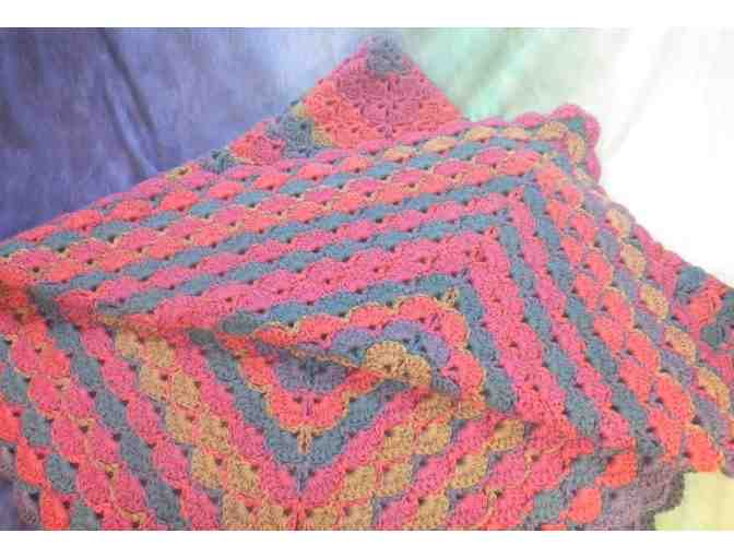 A lovely Afghan 54” x 54”. Created with love by Yvette Yelovina, who has been “crocheting for 45 years and loving every minute of it”. This a pandemic project, using Caron Big Cakes yarn.