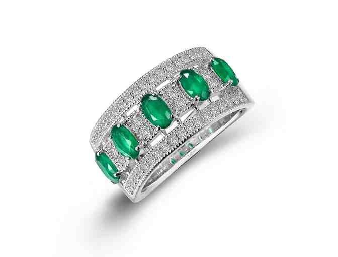 Elegant and sophisticated, this half eternity band is set with Lafonn's signature Lassaire simulated diamonds and oval simulated emeralds in sterling silver bonded with platinum. The exquisite milgrain detail makes this ring a breathtaking piece.