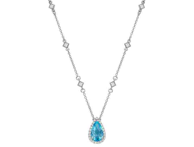 Indulge in the romance of Lafonn's Aria necklace. The necklace is set with a genuine pear-shaped checkerboard-cut blue topaz surrounded by Lafonn's signature Lassaire simulated diamonds in sterling silver bonded with platinum.