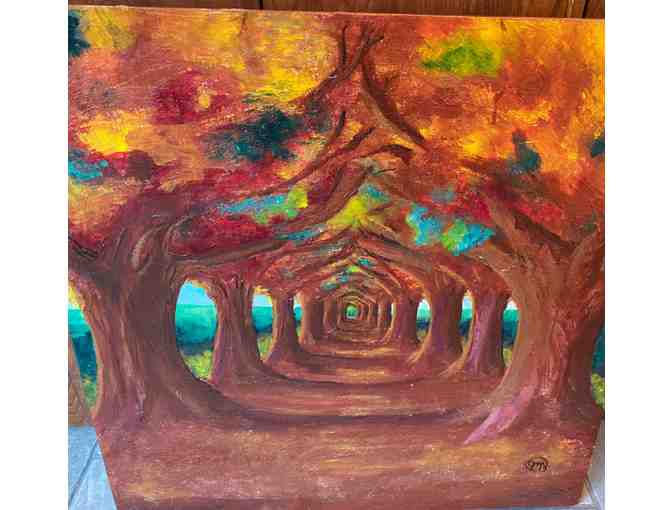 If autumn scenes or colors are what you like best, you will love this Original Oil Painting depicting two rows of trees on either side of a path. The trees form a leafy arch over the path, and the two rows of trees converge at the distant horizon. The tree trunks and branches are a warm brown color that contrasts with the leaves painted in rich tones of russet, amber, gold, and emerald green.