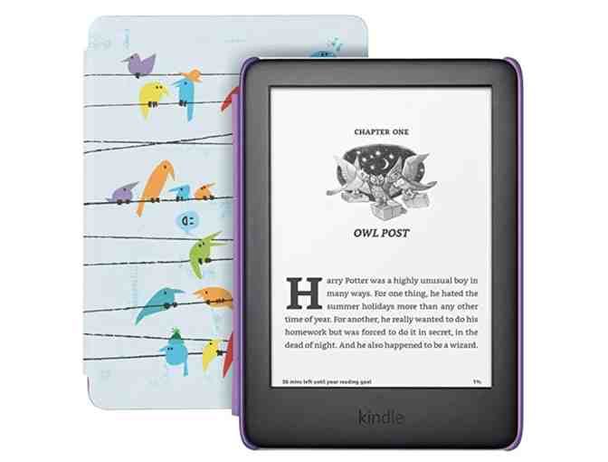 Included with this Kindle Kids package is a 10th-generation Kindle, a charger, a kid-friendly cover featuring colorful birds perched on wires, a one-year subscription to Amazon Kids+, and a 2-year worry-free guarantee. The Kindle Kids can also be paired with Bluetooth headphones or speakers so kids can listen to stories, instead of reading them.