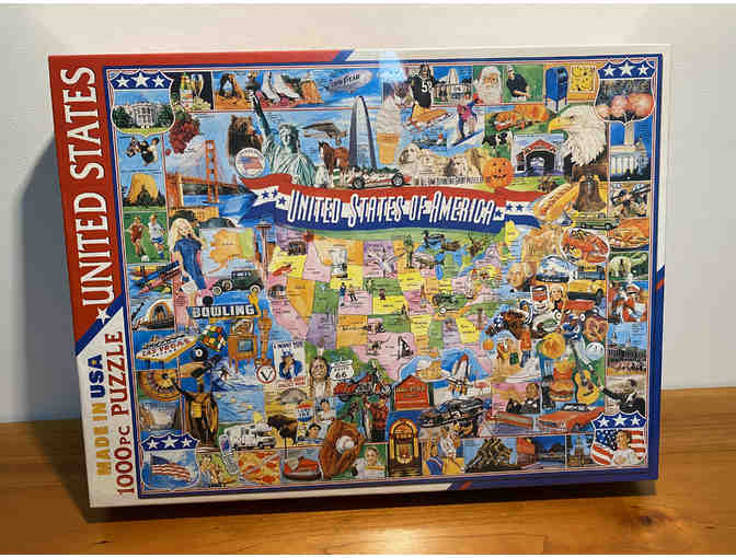 This terrific United States jigsaw puzzle from White Mountain Puzzles, Inc., includes all 50 states and capitals, and celebrates everything from hamburgers to apple pie to the Statue of Liberty and Uncle Sam! This incredible 1000-piece jigsaw puzzle will bring hours of fun and entertainment that everyone in the family can enjoy.