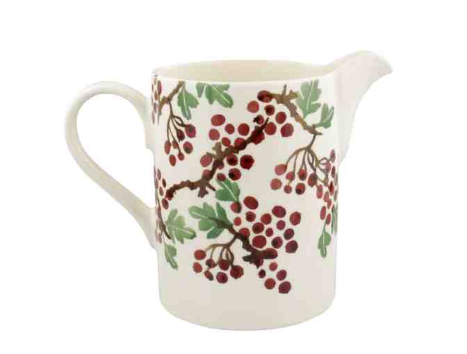 This elegant Emma Bridgewater Hawthorne Berries Large Straight Jug is perfect for serving festive holiday drinks or displaying a holiday bouquet. It is 6 inches tall, with a capacity of 20 fluid ounces. It is dishwasher and microwave safe.