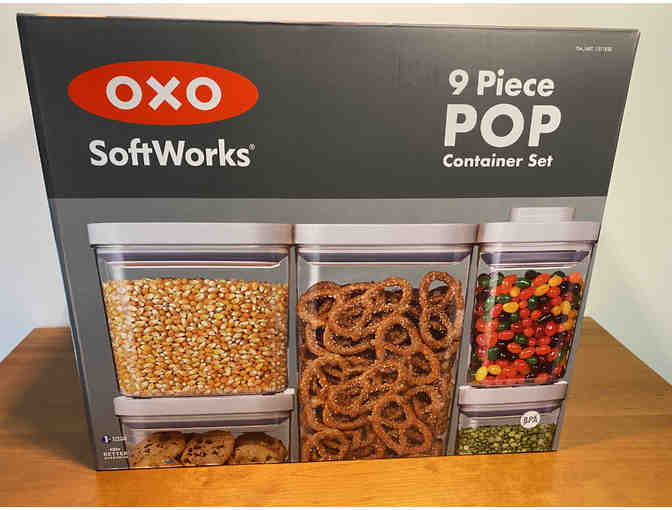 There are 9 containers in a variety of sizes -- big and small, tall and short -- in this versatile set. Push the button on each container lid to seal the container. Push again to release the lid, and the button pops up to double as a built-in handle for the lid. The air-tight seal keeps food really fresh, and the containers stack conveniently to reduce the space they occupy in your cabinet or on your kitchen counter.