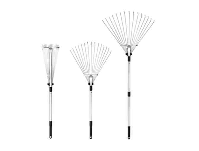 The springy tines can be compressed as close together as 7 inches using a convenient locking lever for work between shrubs and flower beds. As the tines spread out to 22 inches, it is superb for rapidly raking large lawns or other surfaces of loose debris. A simple twist-lock handle governs how long the rake’s handle is -- expanded up to 5 feet long or collapsed down to 3 feet.