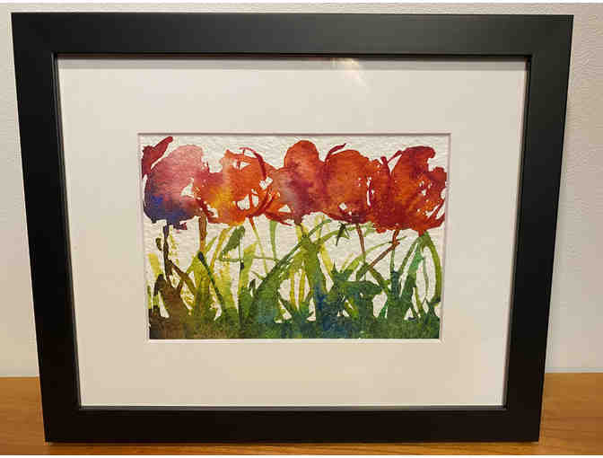 This 2021 watercolor painting, "Spring in New Seabury" by Groton artist Sarah Connell Campbell, shows a profusion of plants in full bloom in vibrant colors of red and green. The 5- by 7-inch painting is matted and framed in an 8- by 10-inch black frame with a saw tooth hanger, ready to be displayed in a special place in your home.