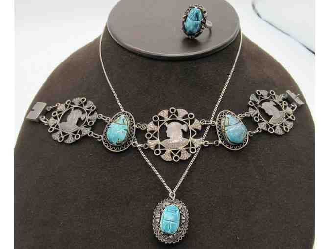 The bracelet has three circular silver pieces with the bust of a woman identified as NEFERITA. In between the silver pieces are turquoise colored stones with carvings pressed into them. It is a stunning piece with the ring and necklace.