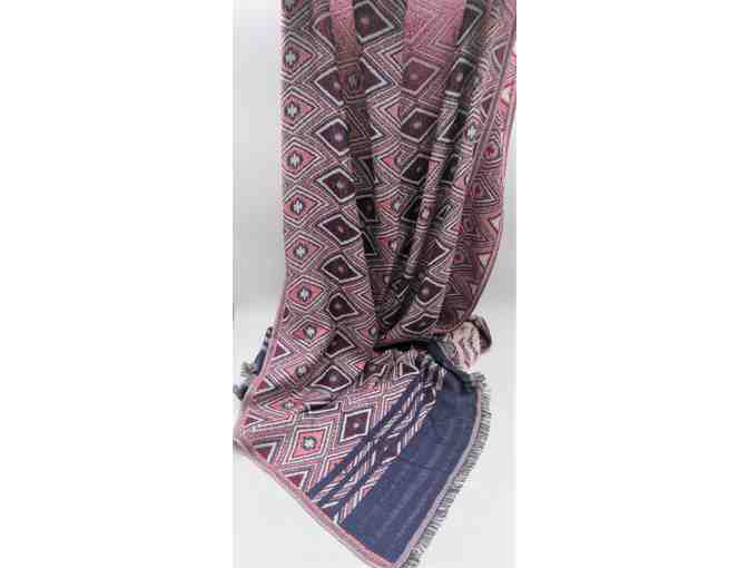 Reversible long scarf that can be worn as a neck scarf or as a shawl. On one side the dominate color is navy blue with reds and whites that when combined look pink and on the flip side the dominate color is white. The pattern is diamond shapes with different combinations of the three colors. The fabric is rayon and modal and is very soft to the touch. This scarf is versitile in color and what you can use it for.