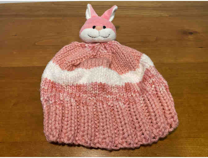Your child will have the cutest hat at nursery school with this handmade knit hat in pink and white colors with a happy pink bunny sitting on top. The hat will fit children up to 4 years old.