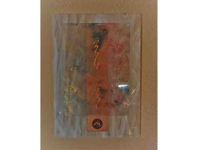 May you feel a quieting of the mind when you pause to look at this handmade layered glass wall art. White-streaked glass forms the backdrop for hand-painted glass reminiscent of a stunning sunrise.