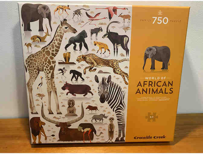 This is a beautifully illustrated puzzle showing, in their natural colors, the animals and birds that inhabit the continent of Africa. The puzzle contains 750 pieces and would make an excellent family puzzle to work on together over the holidays. The finished puzzle measures 20 inches by 27 inches.