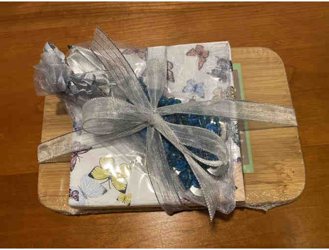 When unexpected guests drop in over the holidays, you'll be ready to entertain them in style with this Bamboo Cheese Board with 3 different types of knives for cutting cheese, and some pretty napkins with colorful butterflies on them. The handles of the cheese knives are elegantly wrapped in blue beads that sparkle in the light. Now all you will need is the cheese!