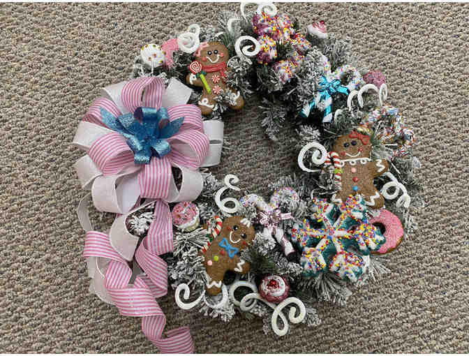 Make your home sparkle for the holidays with this 22-inch lifelike, snow-covered evergreen wreath that is very generously decorated with lots of sweet treats: gingerbread people, candy canes, frosted donuts, decorated cupcakes, and candy-covered pretzels and snowflakes. There is also a large pink, white, and turquoise bow that matches the colors in the candy treats. This is an eye-popping wreath that will become a family heirloom!