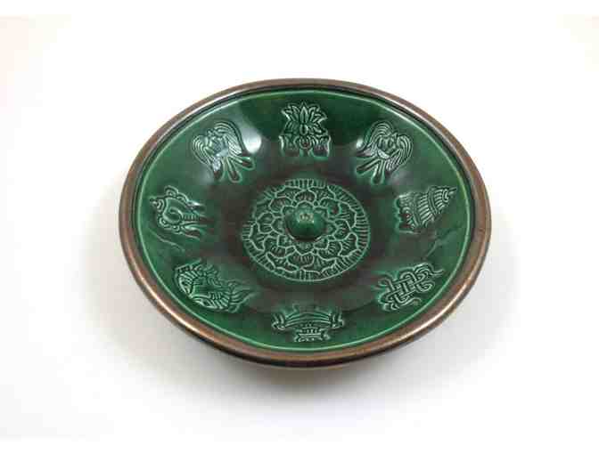 Handmade by Diane De Baun, this ceramic incense burner is imprinted with the eight auspicious symbols of Tibetan Buddhism and finished with a vibrant green glaze.