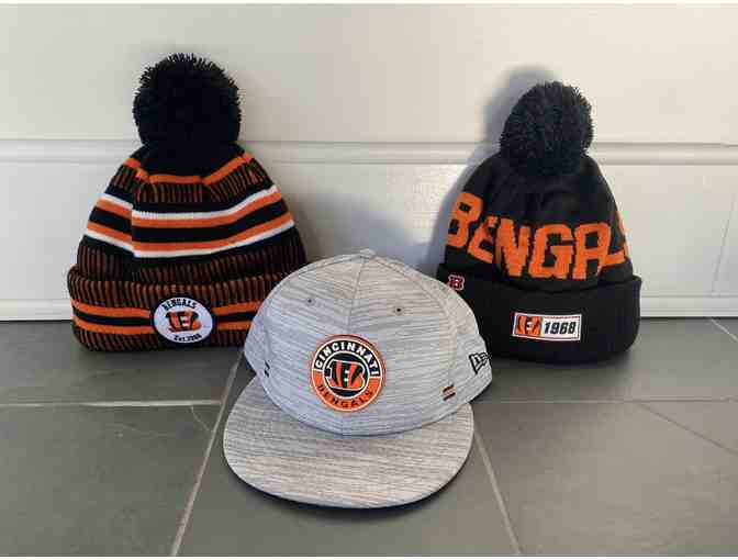 Basket includes 2 Bengals winter beanies and one adjustable hat.
