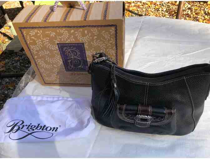Beautiful authentic Brighton handbag in excellent condition. Stylish in black cowhide with brown trim. Has pocket on the front and back for cell phones and accessories. Comes with a box and storage bag.