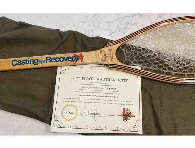 The winning bidder on this item is in for a treat! This landing net features a custom design by PJ's Fine Bamboo Rods. It includes CfR's 25th-anniversary logo along with beautiful flowers on the back. Made of maple and purpleheart woods.