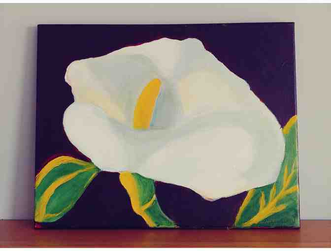 Original acrylic on gallery wrapped canvas painting of a white calla lily on a brown ground. Calla lilies are the subject of many legends and symbols throughout history.