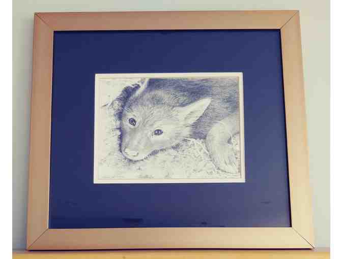 Pen and ink detailed print of a very sweet faced fox resting in the woods, by the late Cape Cod artist Carol Livingston, offered in a large mount within a very nice bronze color metal glazed frame.  She was a graduate of Vesper George School of Art in Boston, MA.