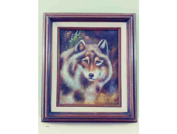 An acrylic on wood painting of a majestic wolf in natural surroundings, mounted in a wood and linen frame. Signed by artist P. Kelland.