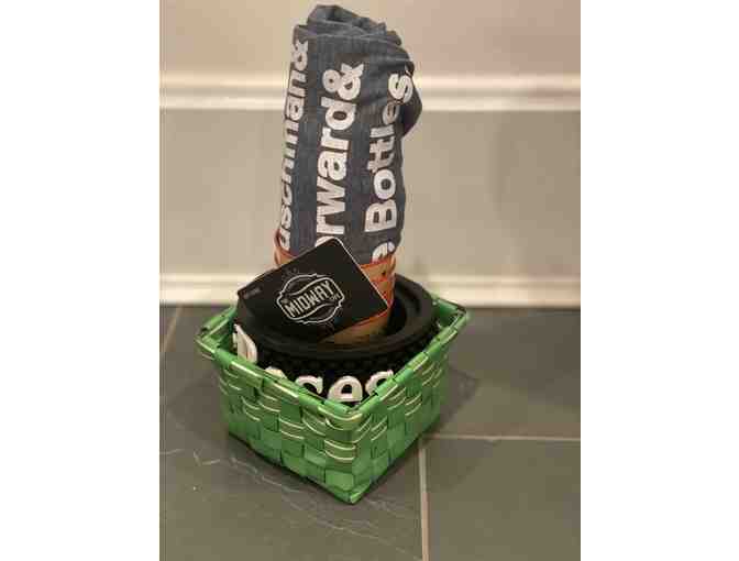 Enjoy a $20 gift Card to the Midway Cafe in Fort Thomas, KY as well as 4 Maker's Mark plastic glasses, a size XL Midway Tshirt, and a Four Roses bar service mat.