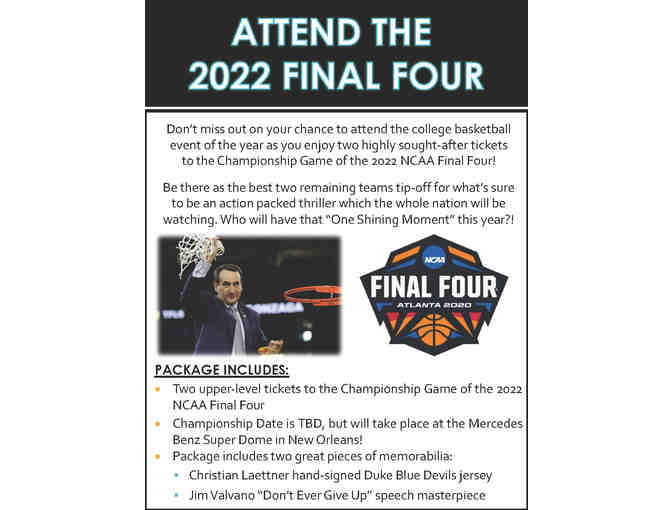 - Two upper-level tickets to the Championship Game of the 2022 NCAA Final Four