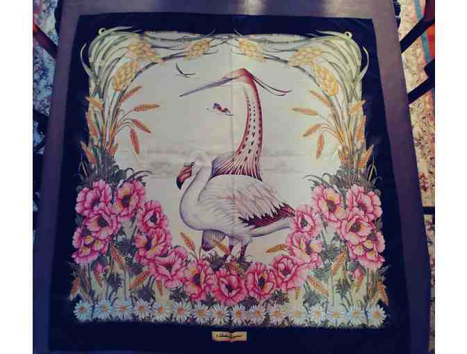 A late donation to the auction, a beautiful authentic vintage Ferragamo signed silk couture scarf with his signature design of a goose and cranes within a patchwork of flowers. Provenance-The previous owner was well known for her signature collection of Ferragamo animal scarves, and this donation came from the family.