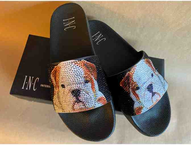 A casual slide profile goes glam in the glittering rhinestone Bulldog embellishments on the wide strap design of INC International Concepts' Peymin pool slide sandals.