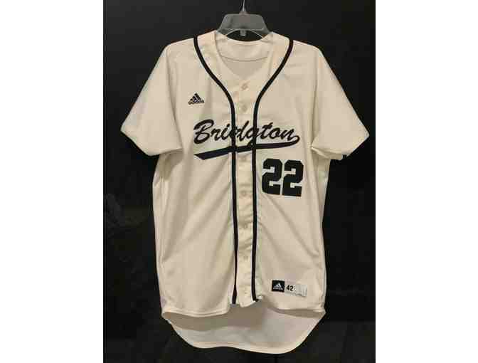 Game-worn cream Bridgton #22 baseball jersey.