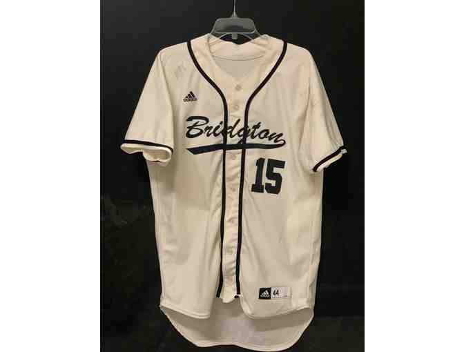 Game-worn cream Bridgton #15 baseball jersey.