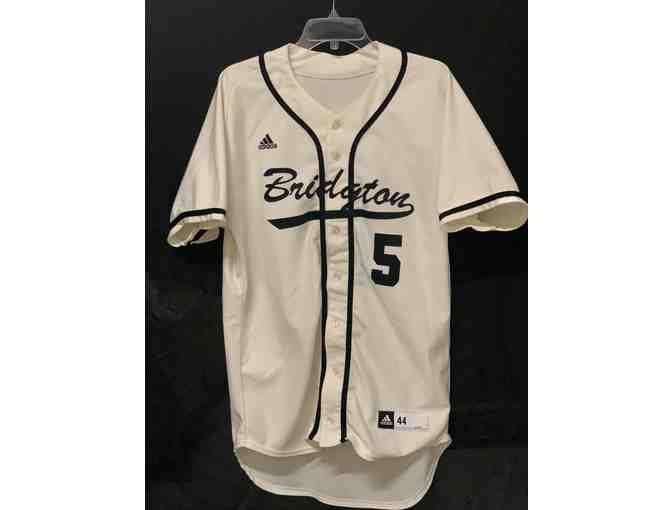 Game-worn cream Bridgton #5 baseball jersey.