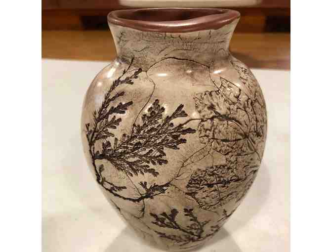 Original design handcrafted vase with beautiful brown tones leaves all around. This size is 6.5 inches.