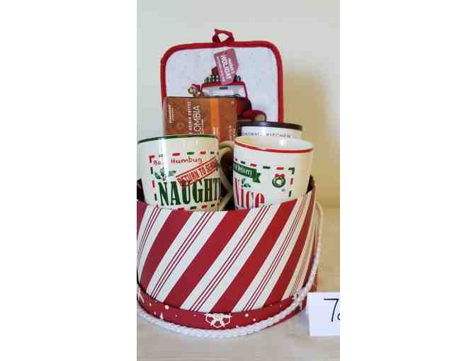 Christmas Morning - basket with coffee, hot chocolate and 2 mugs, pot holders. Value $50