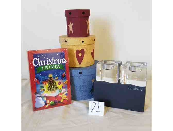 2 Orefors Ice Cube votive candleholders, 3 Christmas stacking boxes, Peanuts Christmas book, Christmas trivia book