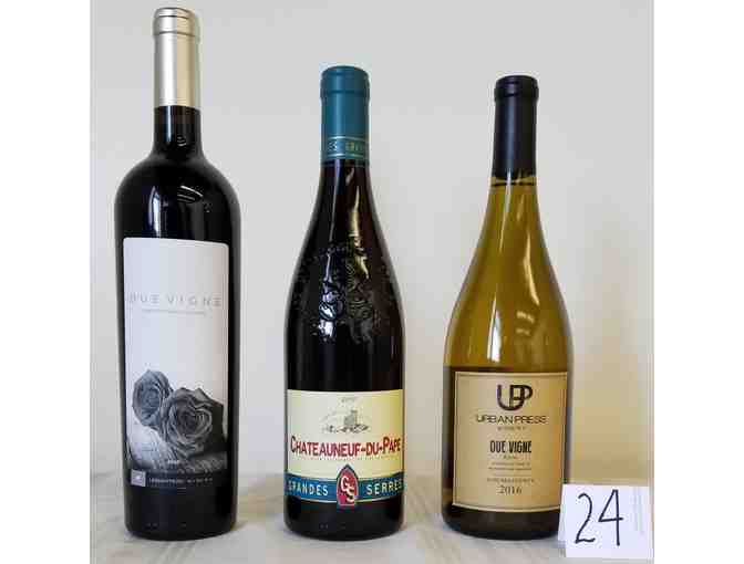 3 bottles of wine: Chateauneuf-du-Pape, Urban Press Due Vigne white and red. Value: $90