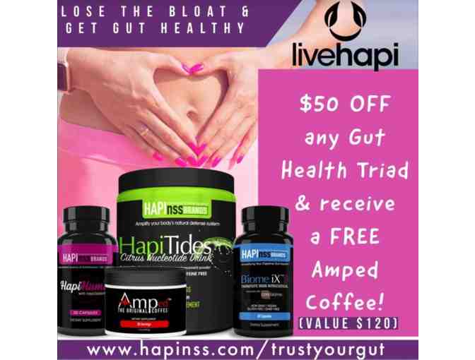 Hapinss Brands Amped Coffee and $50 GC toward Healthy Gut Triad