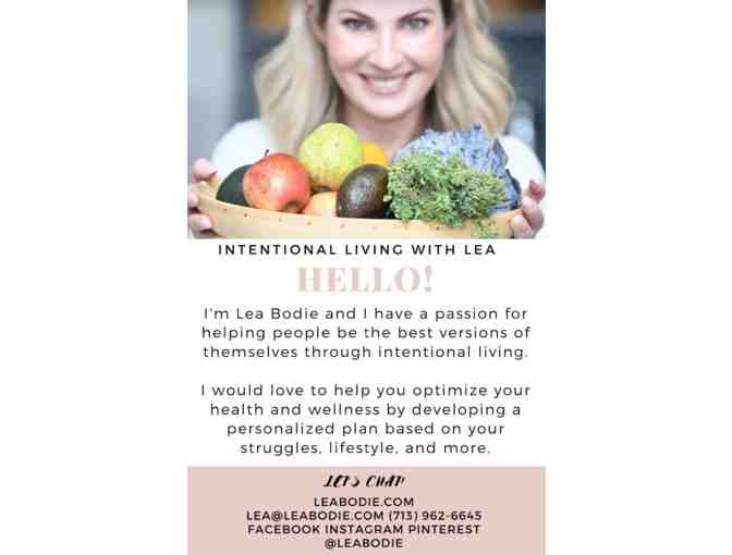 One-on-one nutritional coaching with a Functional Nutrisionist, Lea Bodie, including 30 days of protein shakes, energy fizz, detox tea, and more! Jump Start to a healthier life style!