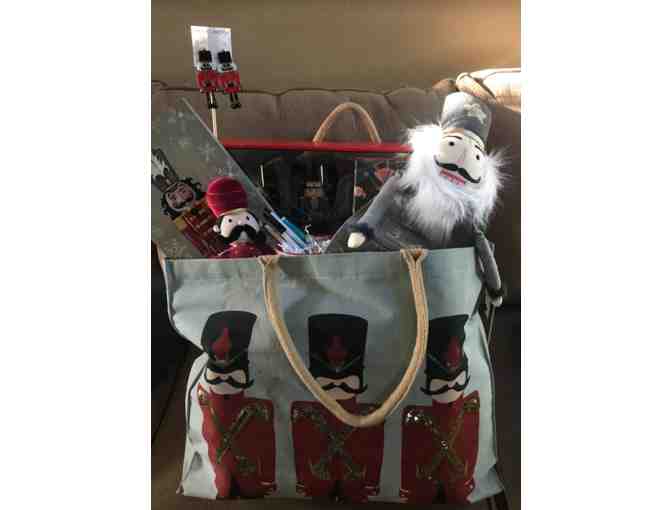 Neiman Marcus Wine Glasses - Set of 4, Rifle Paper Co. Nutcracker Puzzle, Round Top Nutcracker Ornament - Set of 3, Merry & Bright Dillard's Nutcracker Earrings, MonAmi Designs Nutcracker Advent Calendar, The Royal Standard's Glimmer Soldier Carryall Tote, Jellcat Nutcracker Plush, S & K Handpainted Nutcracker Board, Chritmas Spirit Wood Wick Candle, Ceramic Nutcracker Mug.