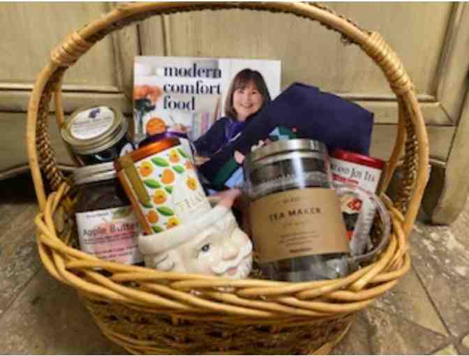 Tea and tea maker, mug and saucer, apron, cookbook, earrings, and jar of jelly.