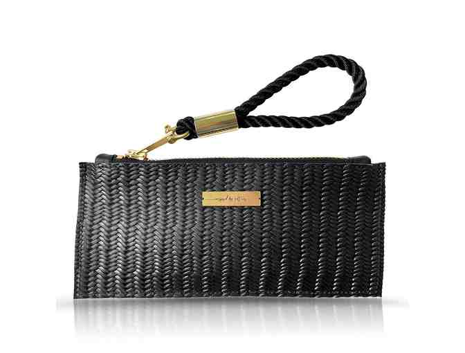 Wildwood Oyster Company's favorite clutch is a showstopper in their newest basketweave collection with signature summer night black wristlet. This clutch combines a unique embossed finished leather in Wildwood Oyster's basketweave design, with jet-black dock line rope, and a golden pop of industrial brass that always catches the light.
