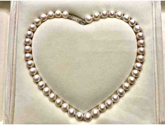 Exquisite ladies 17 inch necklace extending to 18 inches, 9.5 to 10.5 mm round natural pearls with pink overtone, individually knotted with sterling silver clasp and extension.