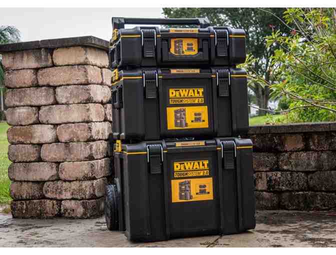 The TOUGHSYSTEM 2.0 Tool Box has patented auto-connect side latches, allowing for 1 hand operation. It also has 2-piece metal wire front latches for added durability when securing tools inside of the box. This tool box offers 20% more tool storage when used with DWST08300 and DWST08450 as part of a tower. It is IP65 rated for dust and water resistance and has a 110 lbs. load capacity. The tool box contains 2 large organizer cups on the inside with removable dividers for optimal organization. The TOUGHSYSTEM 2.0 Tool Box is compatible with all TOUGHSYSTEM products.