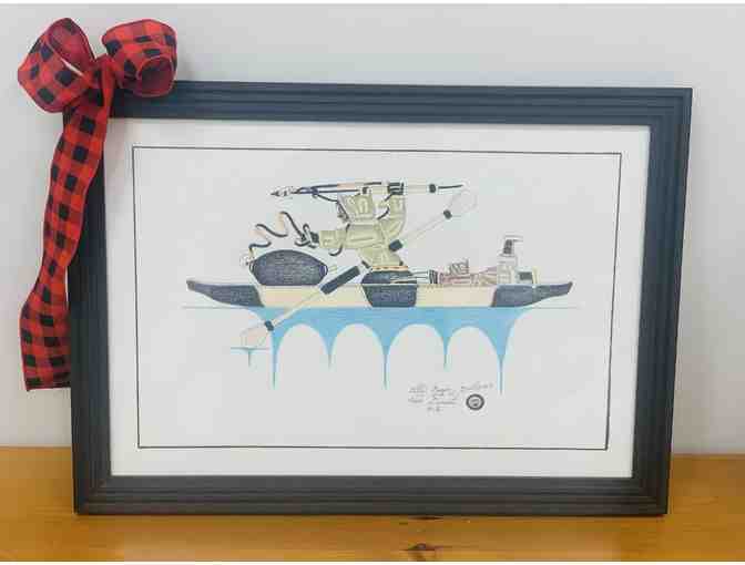 Framed sketch depicting seal hunter and child in a kayak pencil crayon, sized 36 inches wide by 12 inches high, by Cape Dorset artist Peter Ragee, dated October 2020.