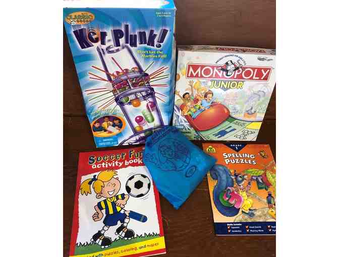 Monopoly Jr., Kerplunk, Jr Rush Hour, spelling puzzles, and soccer fun activity book