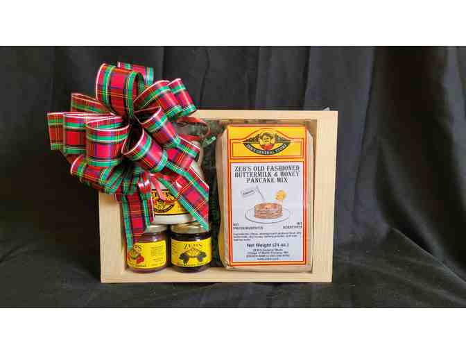 Contains an 8 oz. bottle of Grade A Dark Amber Maple Syrup, 1.5 oz. each of Wild Blueberry and Raspberry Spreads, and a full 24 oz. package of Zeb's Buttermilk and Honey Pancake Mix.