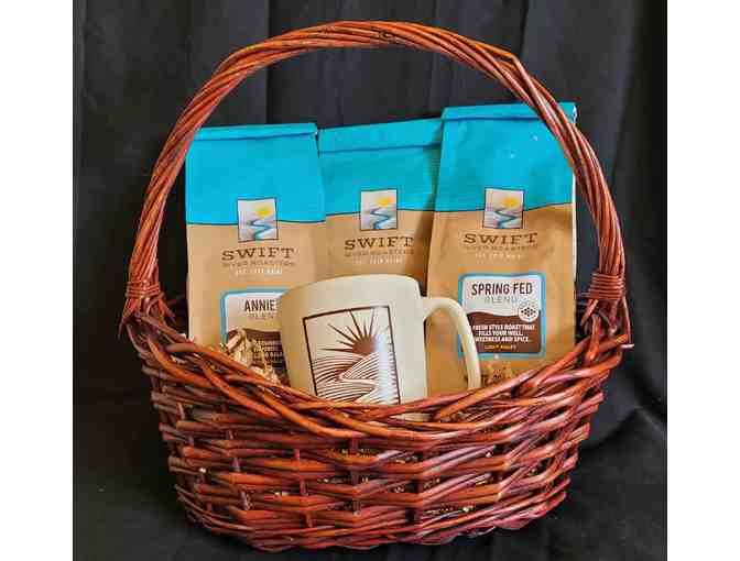 A basket filled with three 12 oz. bags of their most popular blends, along with a ceramic coffee mug with the Swift River logo: