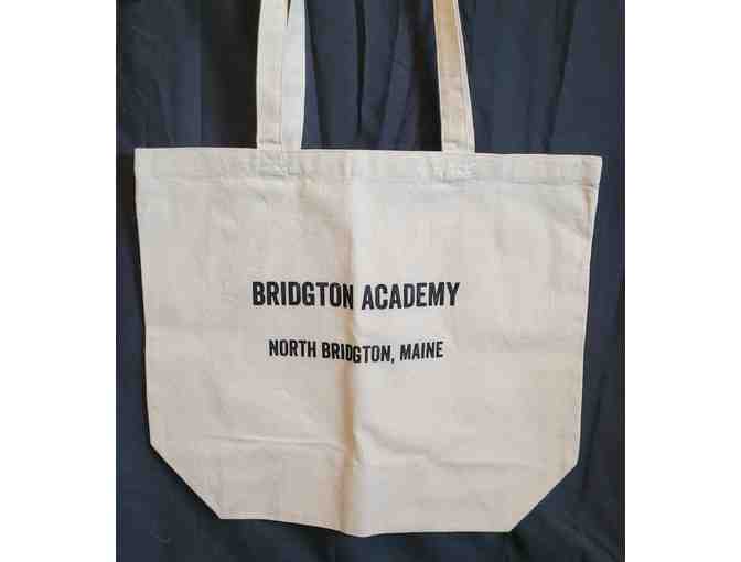 A handy sized canvas bag with Bridgton's location displayed in print.