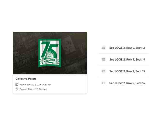 Here's your chance to see a Celtics game! Celtics vs. Pacers on Monday, January 10, 2022 at 7:30 pm in section LOGE12. Tickets will be delivered electronically to the winning bidder.
