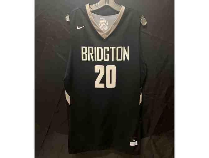 Game-worn black Bridgton #20 basketball jersey.